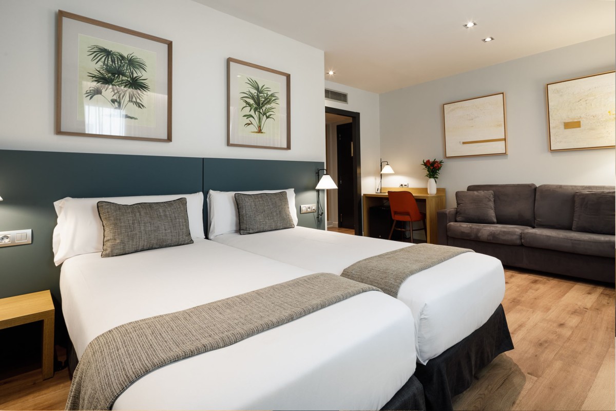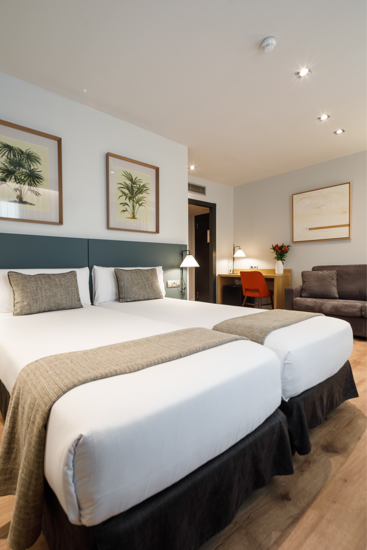 L'hôtel propose des chambres accessibles avec deux lits simples, conçues avec suffisamment d'espace pour un déplacement adéquat en fauteuil roulant. La salle de bain est entièrement équipée avec toutes les commodités nécessaires, y compris des barres d'appui et une douche de plain-pied, ainsi qu'une chaise fixe pour plus de confort.